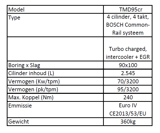 De TMD95CR met een vermogen van 95pk is een 4 cilinder lijnmotor, korte slag, met een BOSCH Commonrail injectiesysteem, turbo intercooler met EGR regeling. Door de z.g. 'korte slag', zijn deze motoren uiterst compact en hebben een laag gewicht. Op de motoren zijn divers type hydraulische keerkoppelingen toepasbaar. Ook is er een 'in-line' keerkoppeling toepasbaar. Deze keerkoppeling is vergelijkbaar met de VELVET keerkoppeling. Hierdoor wordt de inbouwhoogte van deze motor nog lager. Al onze motoren voldoen vanzelfsprekend aan de meest recente Europeese certificatie CE 2013/53/EC voor toepassing in pleziervaartuigen en de EURO IV emissie eisen. |